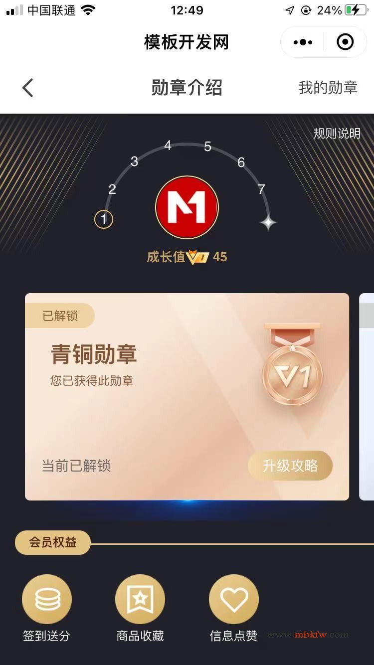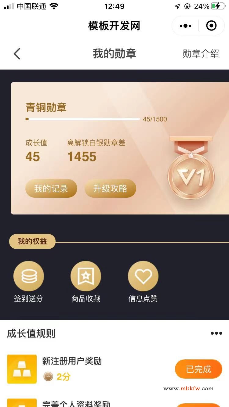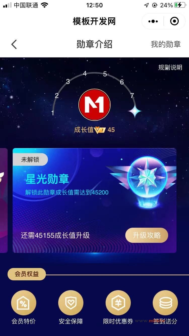模板开发网已开通勋章功能,达到一定成长值可开启不同等级的勋章状态,每天完成不同的任务有不同的成长值奖励