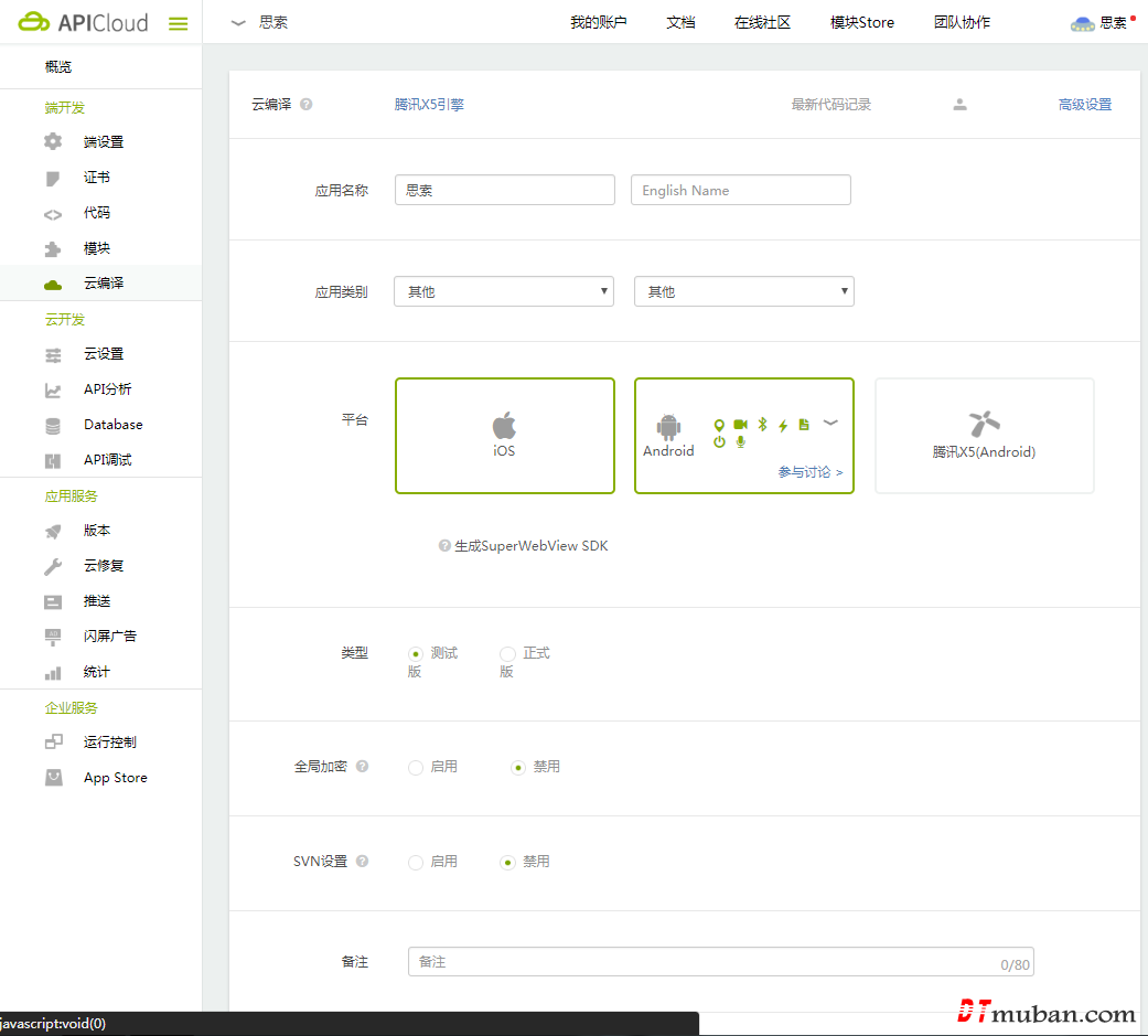 填写基本的信息,然后选择安卓的小机器人,可以增加修改权限,我这里只是测试就选测试版,填写后直接云编辑即可