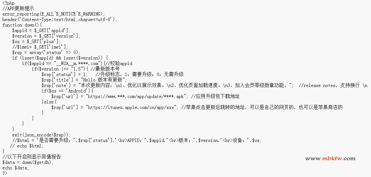 要改的地方也就客户端app.js里的检测地址、服务器端PHP的版本号、安卓下载地址,苹果点击更新按钮后跳转的地址、更新弹窗提示文字。