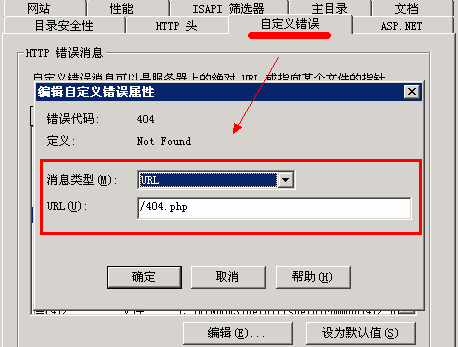 IIS服务器在站点属性,自定义错误类型404里选择URL,填写/404.php