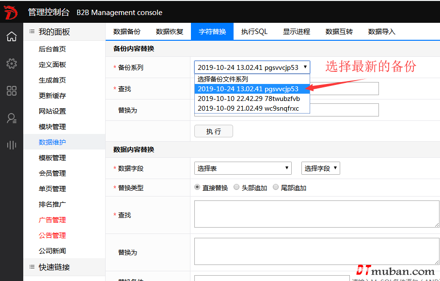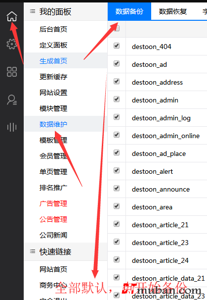 3、打开网站后台,找到:我的面板-数据维护-数据备份,全部勾选,默认,点最下面的 开始备份