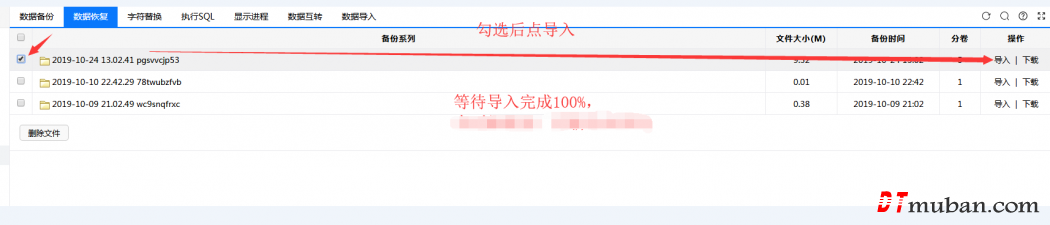 5、100%替换完成以后 ,点上面的 数据恢复 选择最新那个目录,勾选后导入