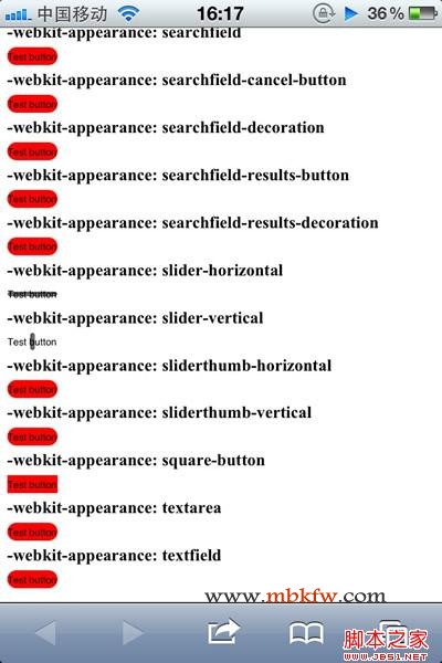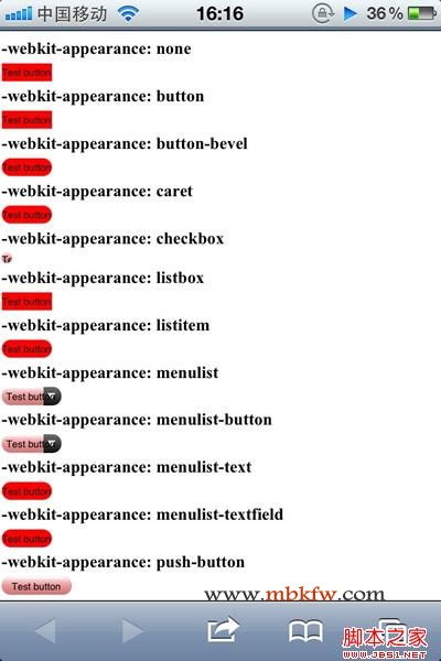 }效果图明显的告诉我们,在不同的“-webkit-appearance”选值情况下,button所渲染的效果是不一样的,详细的测试代码大家可使用safari浏览器点击这里。有关于“-webkit-appearance”的详细介绍,这回算是知道了,最后我建议大家,我们可以直接在“reset.css”样式文件中加处这么一句: