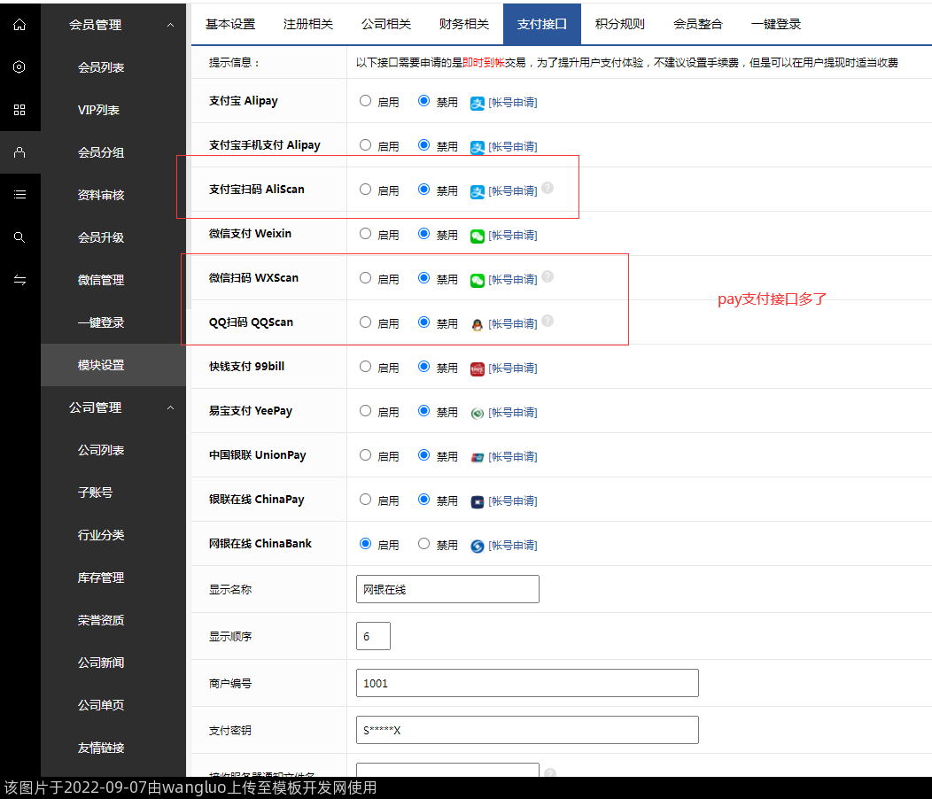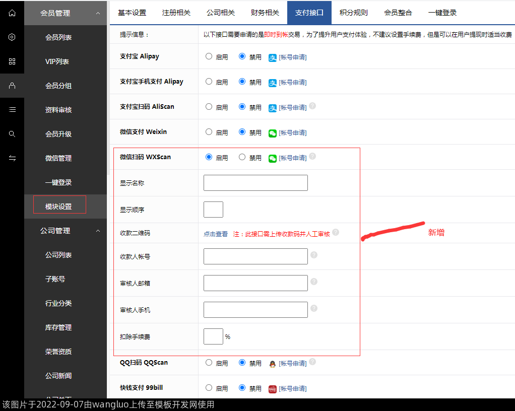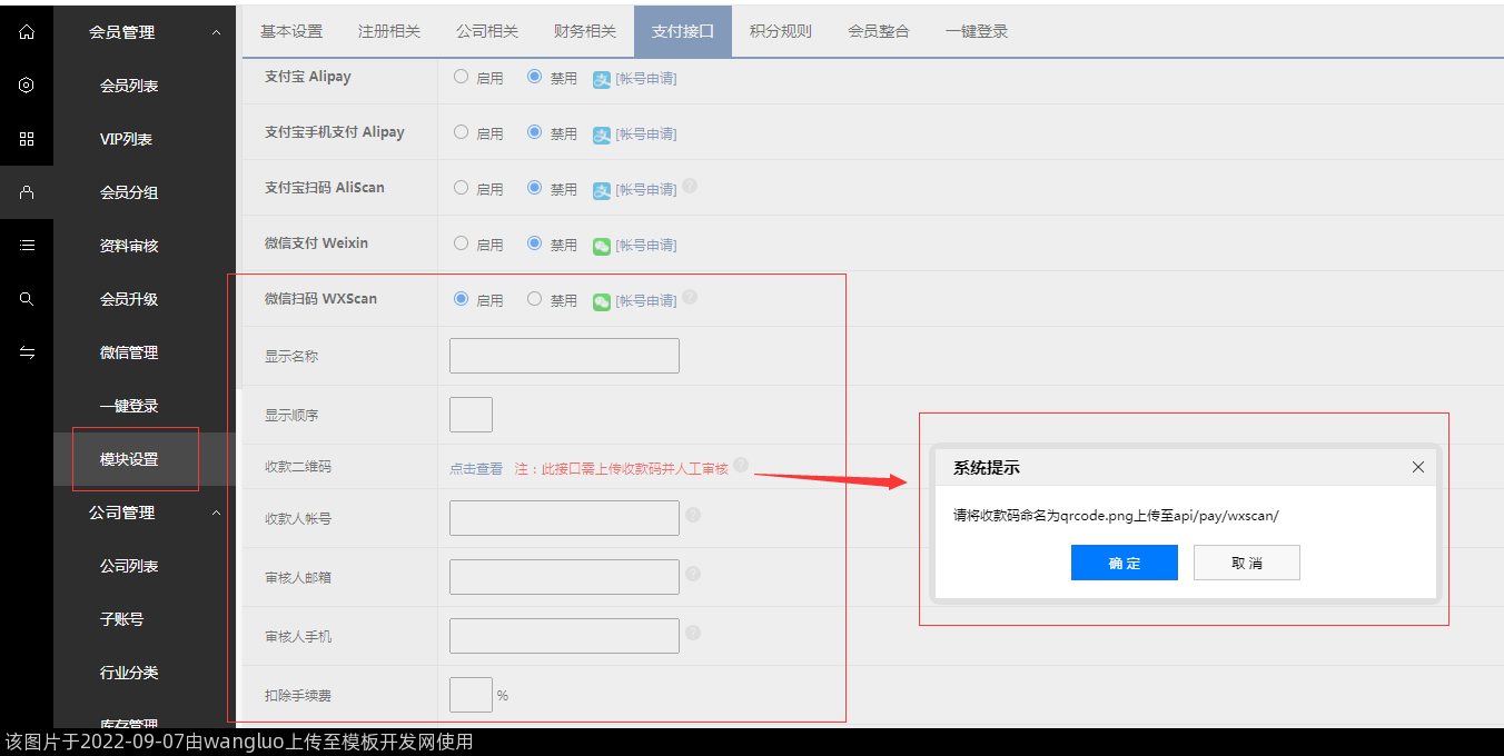 总后台-会员模块-模块设置-支付接口-微信扫码(意思就是二维码收款,充值需要人工在后台审核后,充值金额才到用户账号上,不是自动到账)