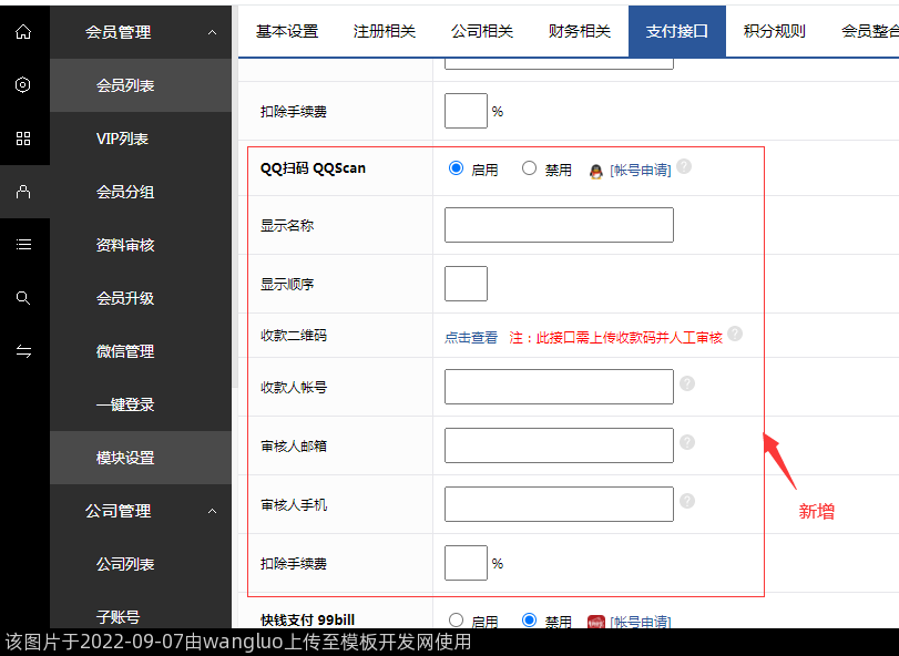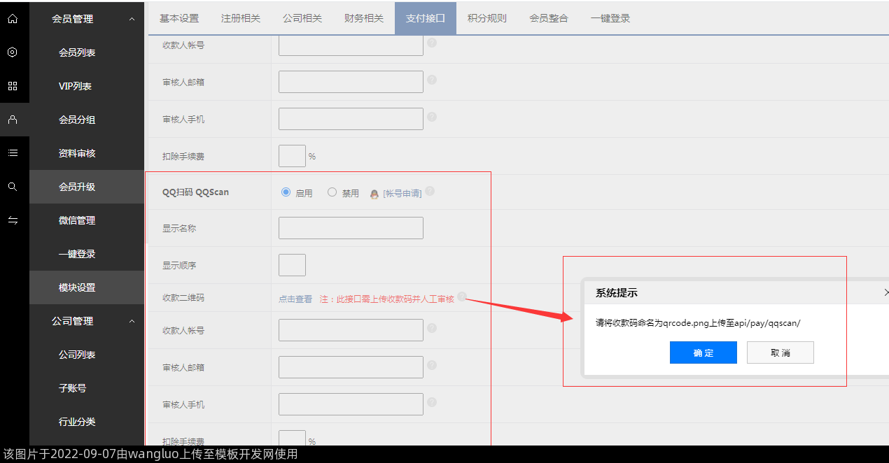 总后台-会员模块-模块设置-支付接口-QQ扫码(意思就是二维码收款,充值需要人工在后台审核后,充值金额才到用户账号上,不是自动到账)