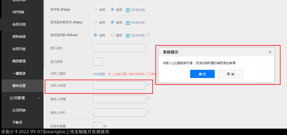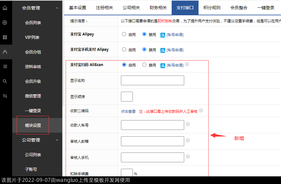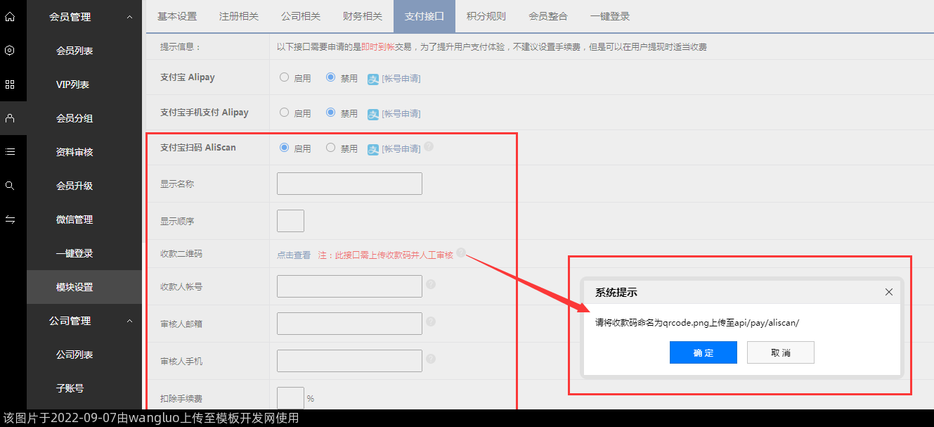 总后台-会员模块-模块设置-支付接口-支付宝扫码(意思就是二维码收款,充值需要人工在后台审核后,充值金额才到用户账号上,不是自动到账)