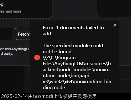 Error:1 documents failed toadd. The specified module couldnot be found.\?\C:\ProgramFiles\AnythingLLM\resources\backend\node modules\onnxruntime-node\bin\napiv3\win32\x64\onnxruntime binding.node