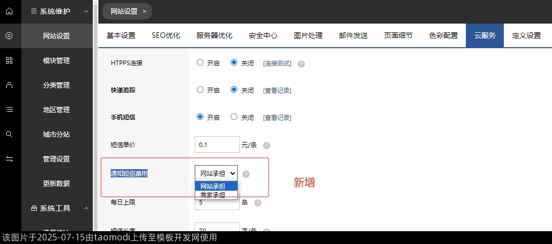 新增-网站设置-云服务-通知短信费用承担方式