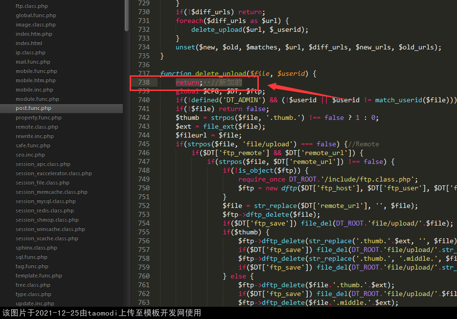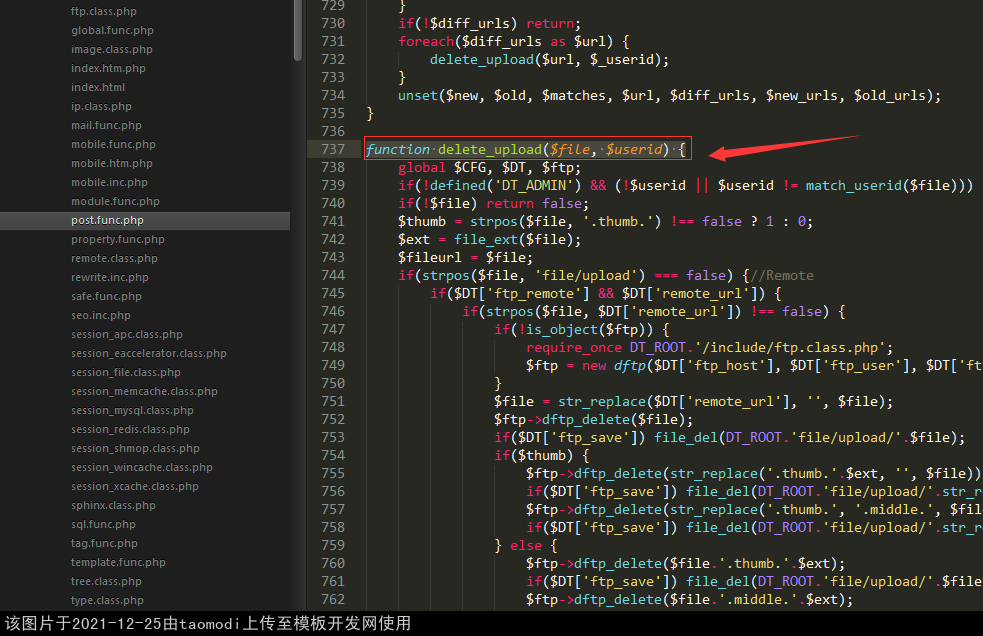 默认大概在 737行 ,或者 搜索 function delete_upload($file, $userid) {