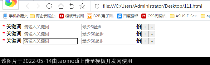 <b class='control-label'><span style="color: #ff0000;">*</span> 关键词 <input class='span5' name="keyword" type='text' value="" placeholder="请输入关键词" /> <input class='span3' name="put_num" type='text' placeholder="最少5起步" value="" />份<input type="button" id="plus" value="+"><input type="button" id="reduce" value="-"> </b>