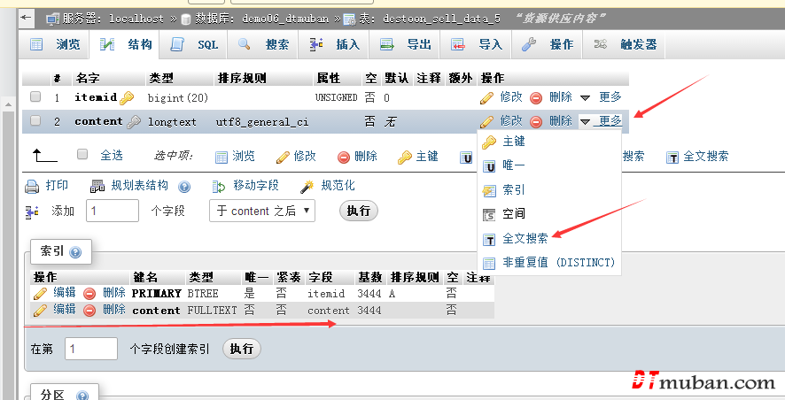 打开 phpmyadmin 找到 destoon_sell_data_5 这个表,点 结构 ,下面就看图,完成后 索引就会多一项 content 证明就操作对了,一切完成就可以去测试了