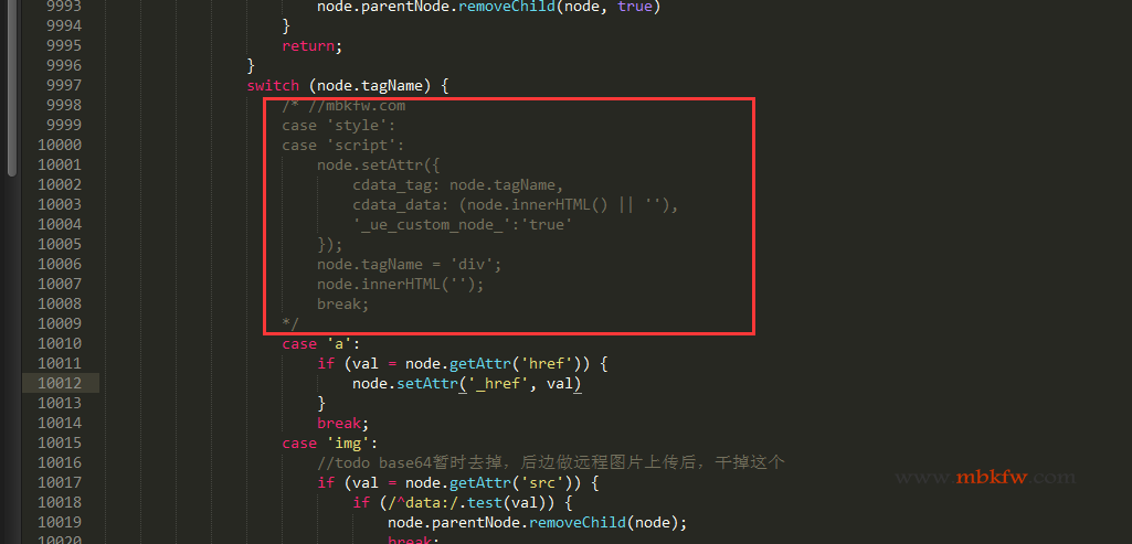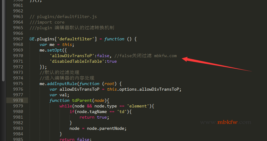 me.setOpt({ 'allowDivTransToP':false, //false关闭过滤 mbkfw.com 'disabledTableInTable':true });2、修改过滤规则