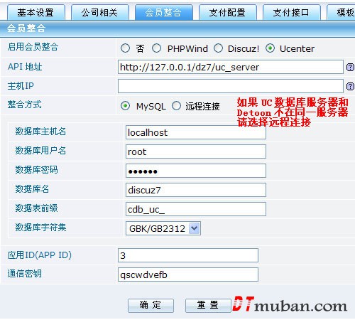3、进入Destoon管理后台 -> 会员管理 -> 模块设置 -> 会员整合 填写相关参数