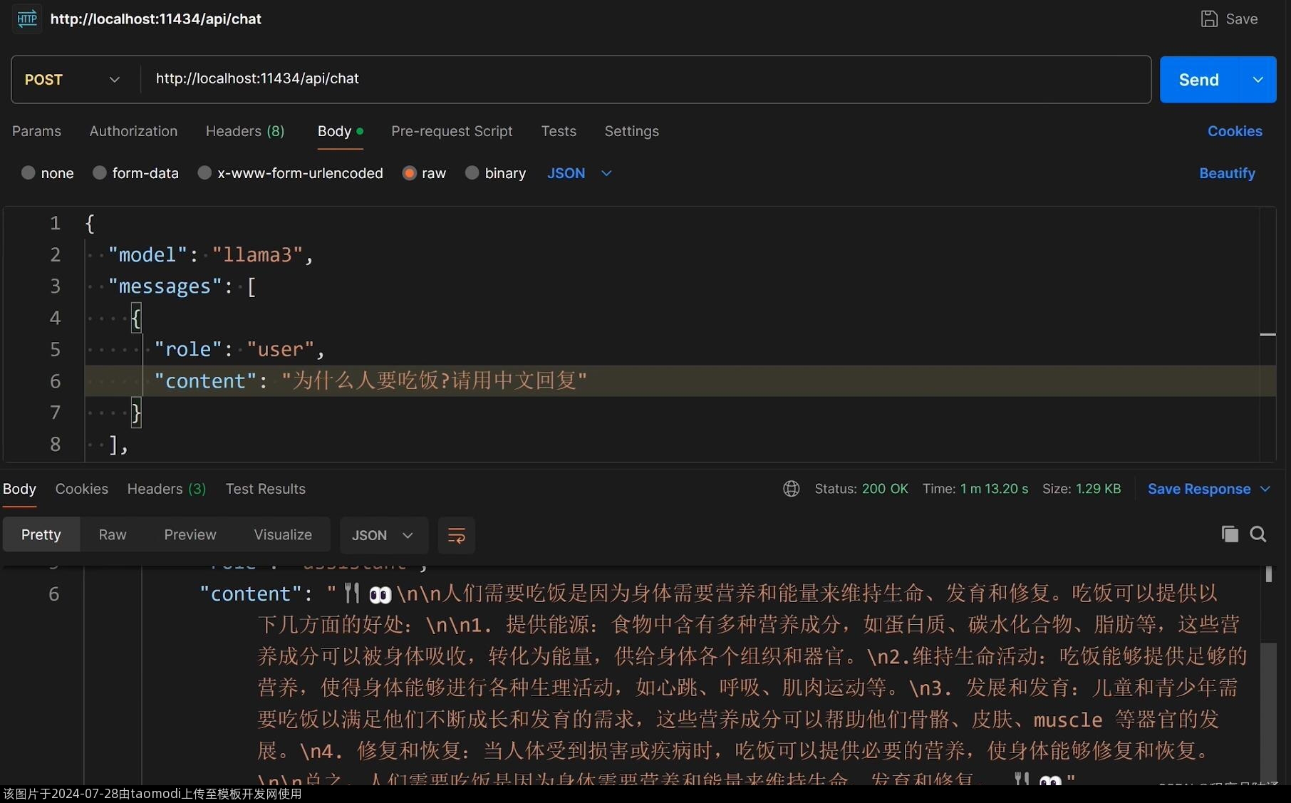 ollama会自动生成Llama3的API接口访问地址,API文档地址:https://github.com/ollama/ollama/blob/main/docs/api.md