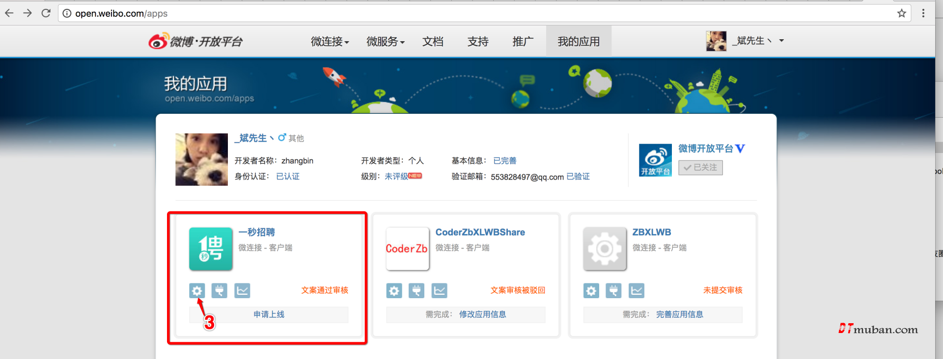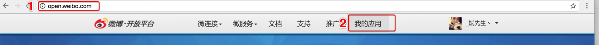 步骤1,2:登录新浪微博开放平台,然后点击我的应用。