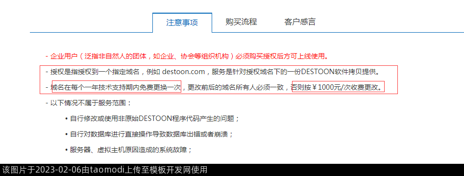 - 授权是指授权到一个指定域名,例如 destoon.com,服务是针对授权域名下的一份DESTOON软件拷贝提供。
