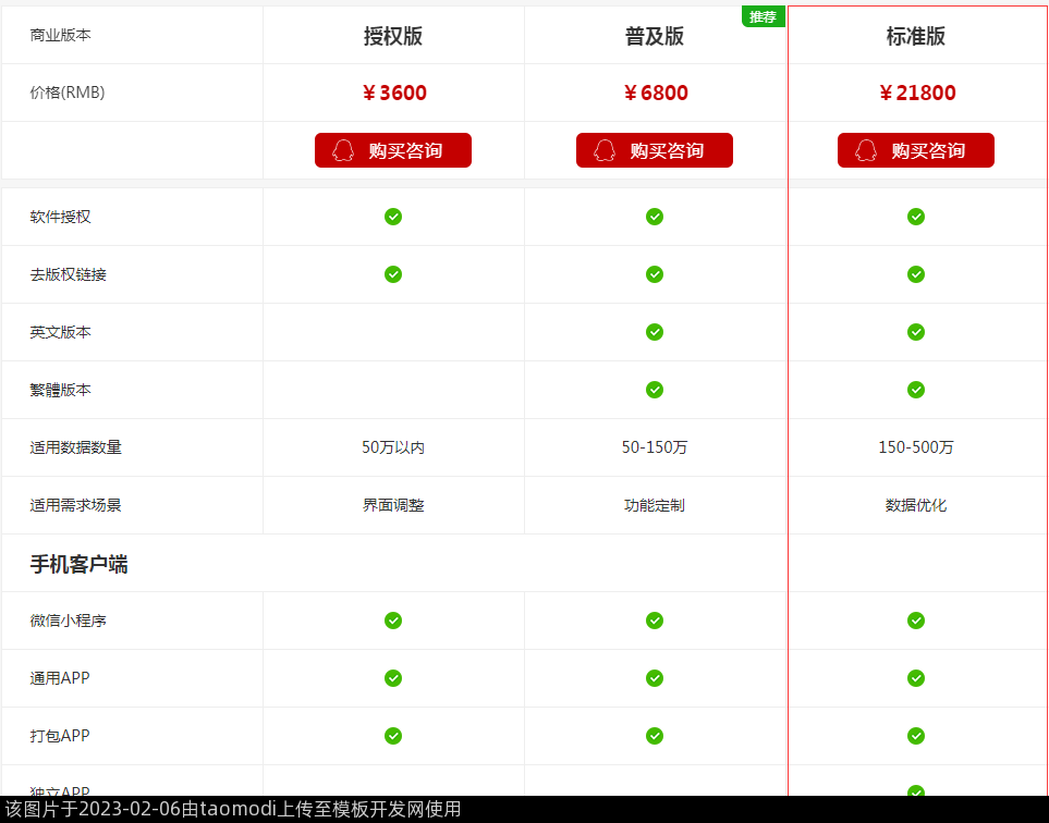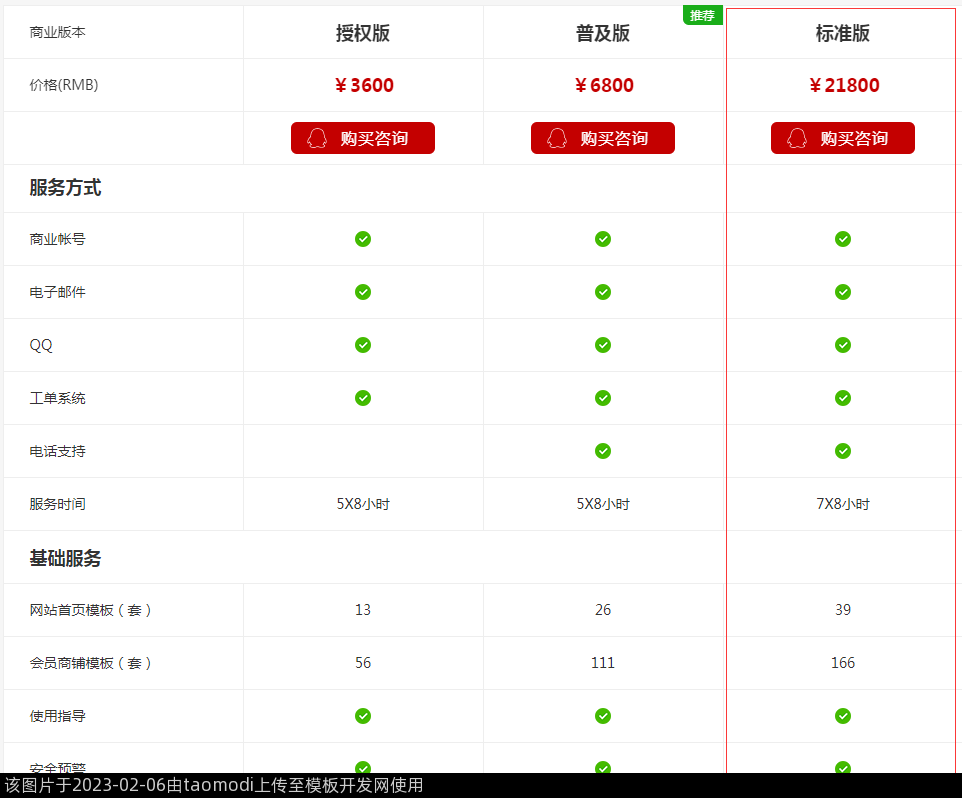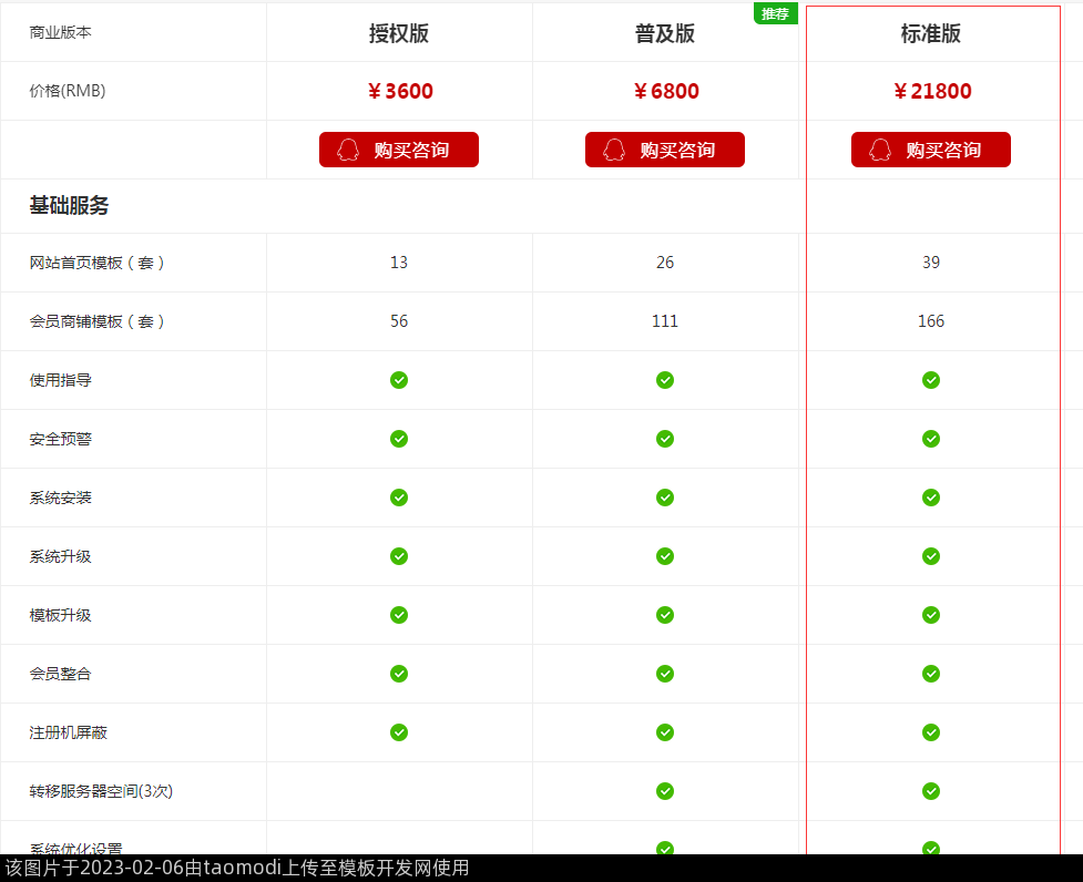 标准版:免费1年技术服务,送的模板由destoon提供(送39套首页模板+166套商铺模板)