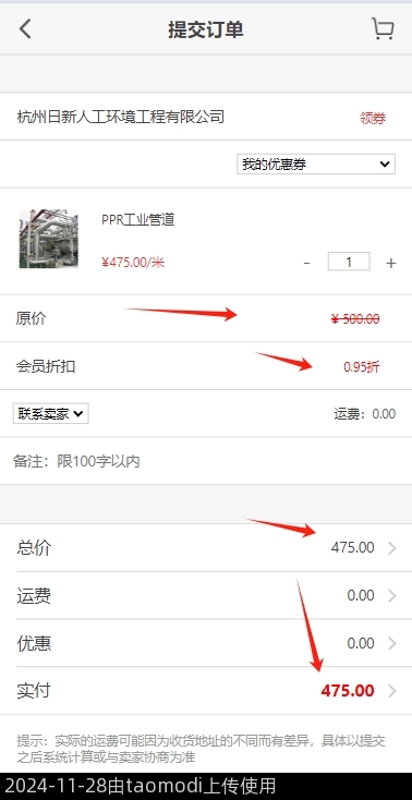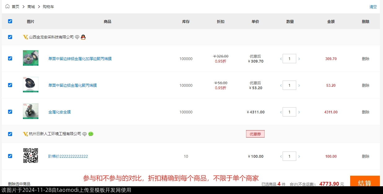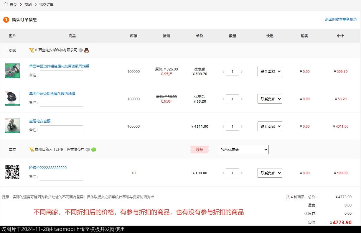 3-6、不同商家,不同折扣后的价格,有参与折扣的商品,也有没有参与折扣的商品,下单时,参与了折扣的商品,自动计算折扣后的价进行结算