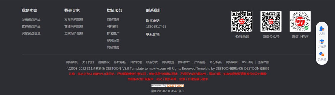 3、本店所售模板仅为destoon8.0程序的模板,程序官方destoon,个人用户可根据自己的实际情况选择是否购买官方授权及技术支持。对于destoon8.0程序不熟悉朋友慎拍(因一部分问题是因DT程序使用的不熟悉,虽尽可能去解答每个用户的每个提问,但因服务范围有限,不保证非本模板问题都给予解决,请您谅解!)
