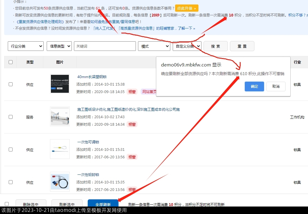 供应一键全部刷新(前提,后台需设置以更新时间排序)