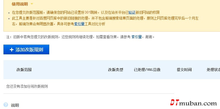您如果正在进行比更换域名更复杂的改版,比如目录级别大量链接进行跳转,可以通过正则规则告知百度。到网站改版工具添加新改版内容,选择“提交正则规则”,输入旧网址规则和新网址规则,以及两组新旧url样例帮助校验规则;填完后点击提交。提交后注意关注系统反馈的校验信息,校验周期一般为一周左右。